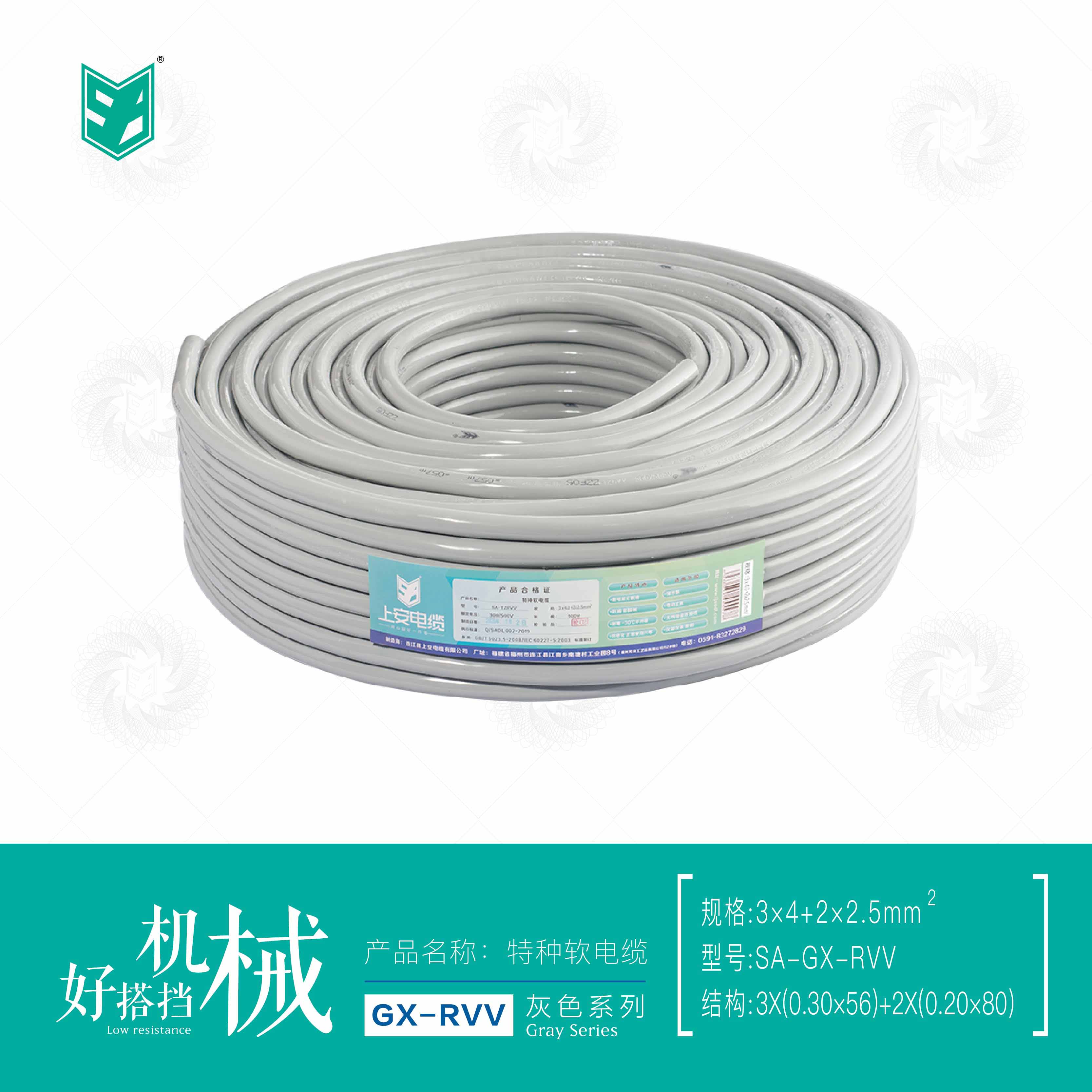 ---------------------------------------------------------上安电缆,灰色系列特种软电缆规格:2X2.0mm²结构:3X0.30x56+2X0.20x80适用范围:适用于家用电器、电动工具、水泵、无线排插连接线、仪器仪表、照明、机械设备、工程布线等要求柔软的场合